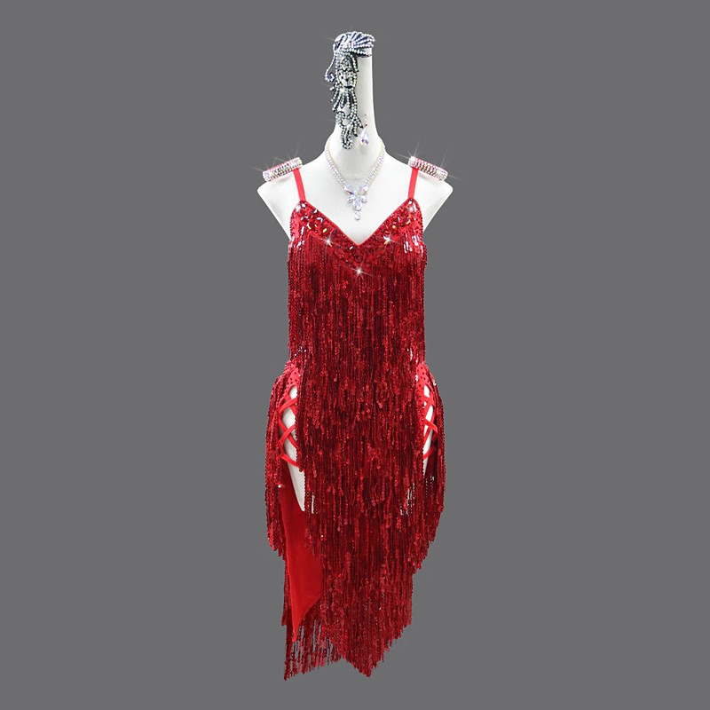 Latin Salsa Dance Dress Crystal / Rhinestone Tassel Sequins Women's Performance Party Sleeveless Chinlon Spandex