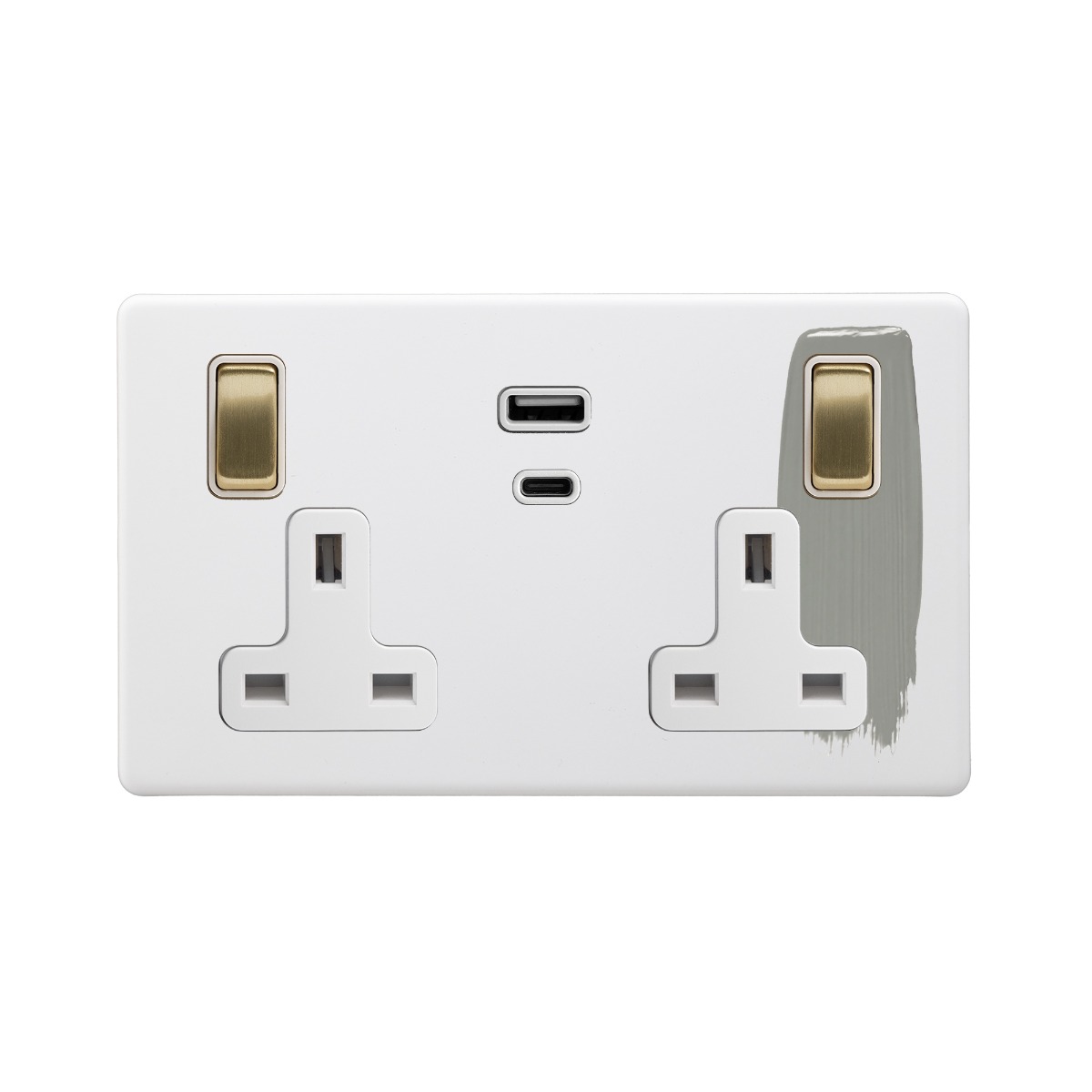 Soho Lighting Primed Paintable 13A 2 Gang Super Fast Charge 45W USB A+C Socket with Brushed Brass Switch with White Insert