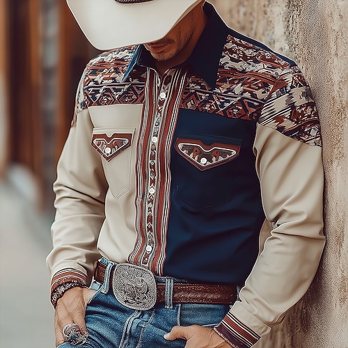 Per uomo Motivo Geometrico Etnico Camicia Camicia Western Camicia da cowboy Manica Lunga Vintage Retrò All'aperto Casuale Abbigliamento da lavoro Primavera Autunno Collo ripiegato Due tasche