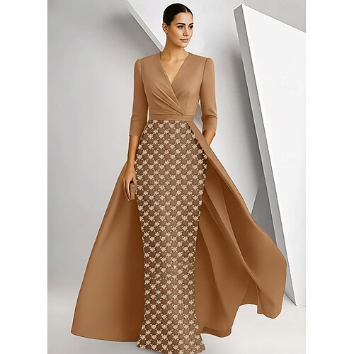 Linea ad A Lunghezza al pavimento Perline ricamate Abito Formale Abito da madre della sposa Abito da Sera Abito da ballo con sopragonna Abito formale Elegante Scintillante Brillanti Manica 3/4 Scollo