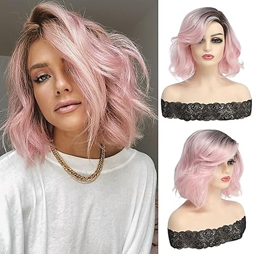rosa Perücken, kurzes, gewelltes Haar, pastellfarbene Bob-Perücke mit Pony, schulterlanges Kunsthaar für Frauen und Mädchen, farbenfrohe Cosplay-Perücke aus synthetischer hitzebeständiger Faser für