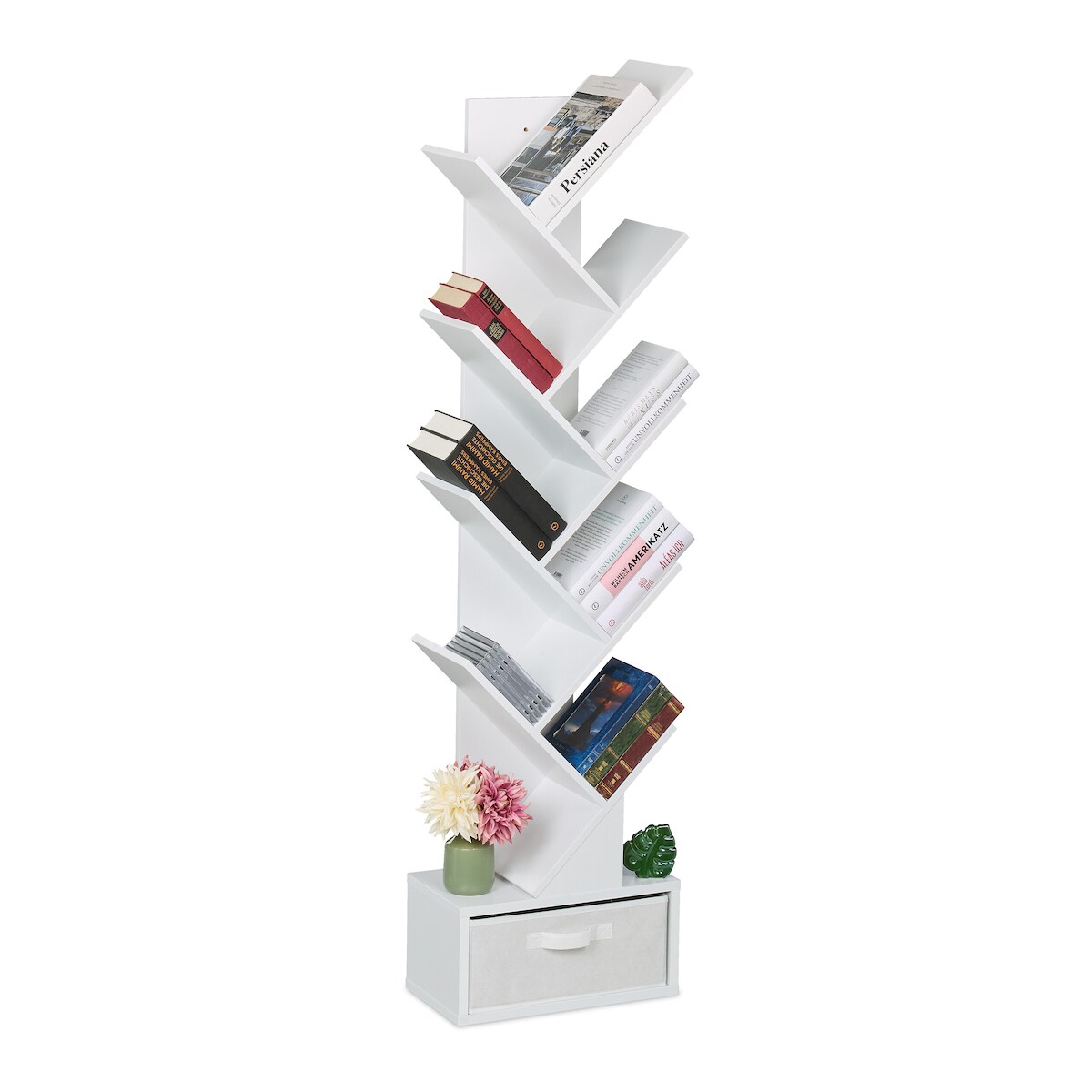 Relaxdays Bücherregal, 9 Ebenen, HxBxT: 146 x 38 x 22 cm, Baumform, Bücher, CDs, DVDs, Bücherbaum mit Schublade, weiß
