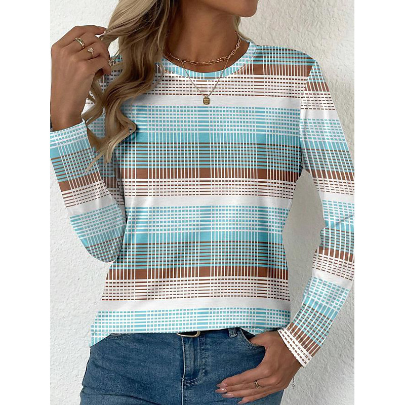 Women's T shirt Crew Neck Long Sleeve Tunic Graphic Geometric Plaid Vintage Stylish Classic Round Neck Regular Tops Daily Print Khaki Fall
