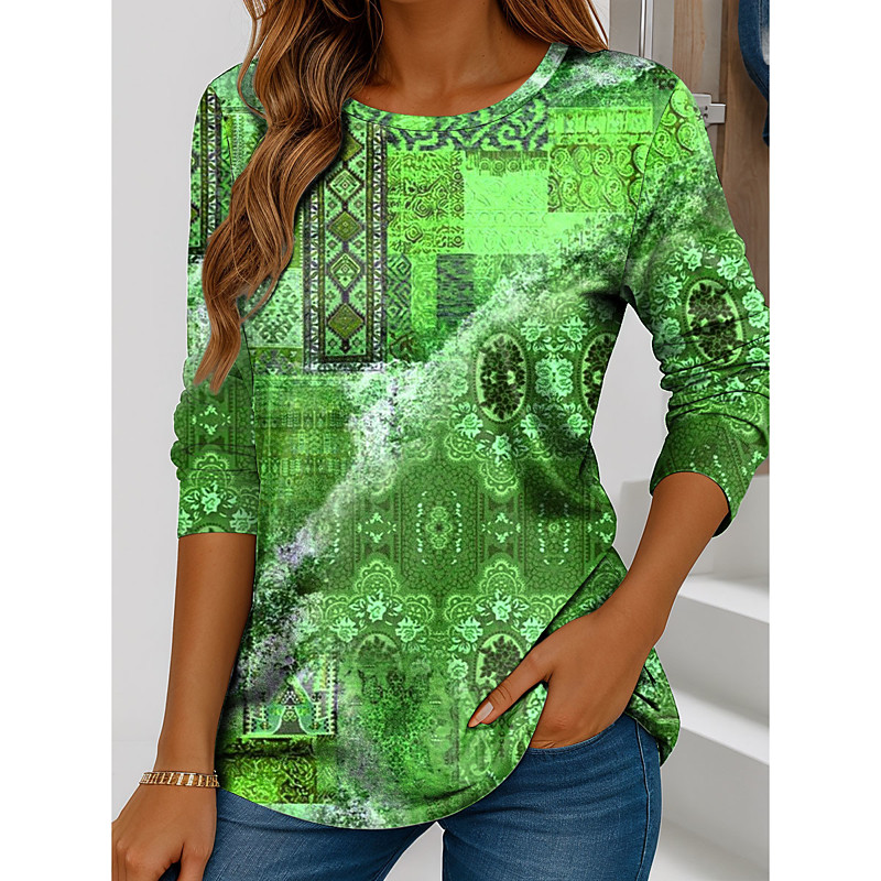 Women's T shirt Long Sleeve Graphic Geometric Vintage Stylish Casual Long Sleeve Crew Neck Regular Tops Daily Print Red Blue Purple Green Khaki Spring Fall Prefall