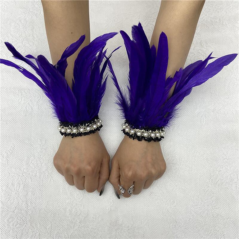 Carnival 2026Rio Carnival Samba Accessories Women's Black Feather Wrist Cuffs with Pearl Lace, 1 Pair Natural Feather Wristband Bracelets Brazil Festival Performance Costume