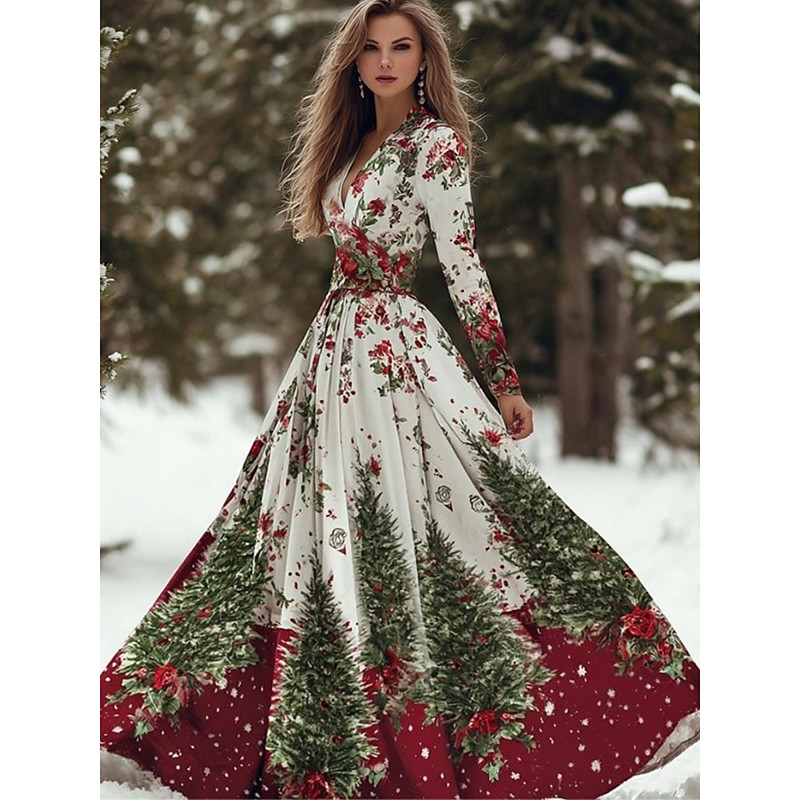Christmas Women's Maxi Dress A Line Dress Pleated Dress Party Casual Boho Daily Date Going out Regular Fit Graphic Long Sleeve V Neck White Blue Fall Winter