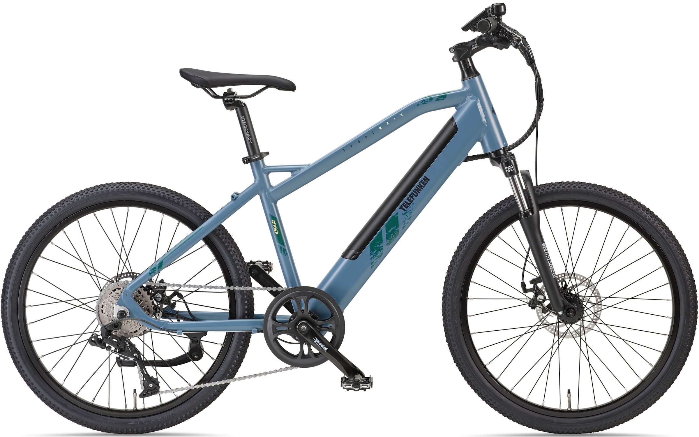 E-Bike TELEFUNKEN "Aufsteiger M915" Gr. 41, blau (blau, schwarz), Elektrofahrräder, 41cm, 24 Zoll (60,96cm), Pedelec, Elektrofahrrad für Damen u. Herren, MTB