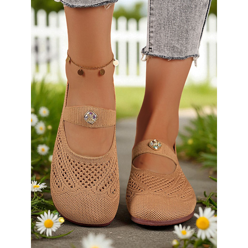 Women's Wide Width Flyknit Mary Jane Flats – Breathable Comfort Shoes with Rhinestone Strap for Walking and Daily Wear