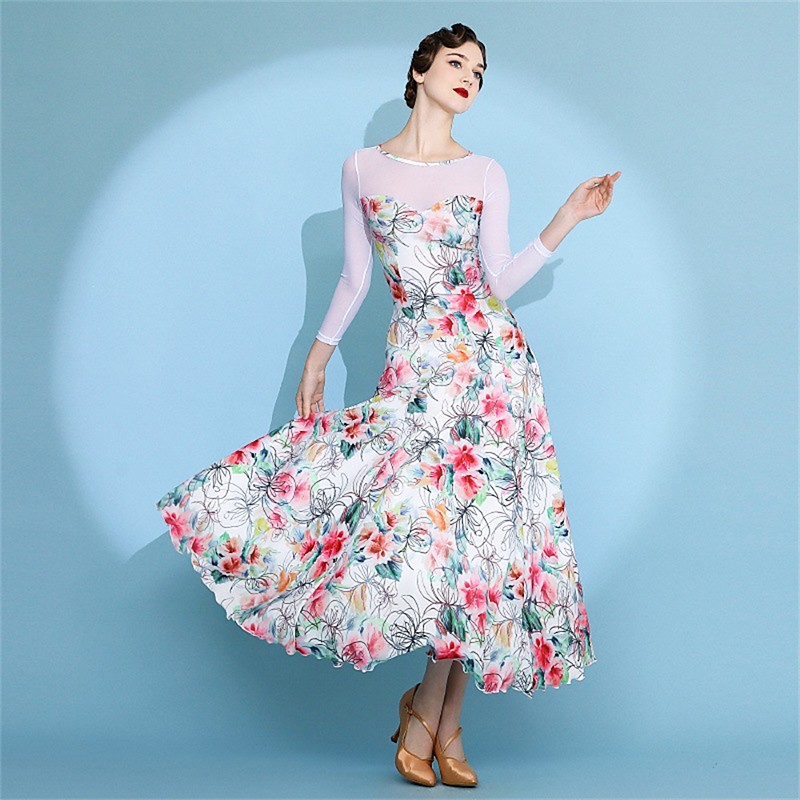 Floral Print Ballroom Dance Dress for Women - Long Sleeve A-Line Gown with Elegant Sheer Sleeves for Competitions, Latin, and Dance Events - Blue White