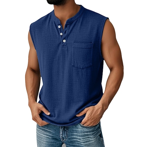 Herren leinenhemd Tank Top Henley Hemd Weste Ärmellos Henley Sommer Einfach Mode Designer Muskel Knöpfe Outdoor Ausgehen Fitnessstudio Schwarz Weiß Marineblau Top T-Shirt für Herren