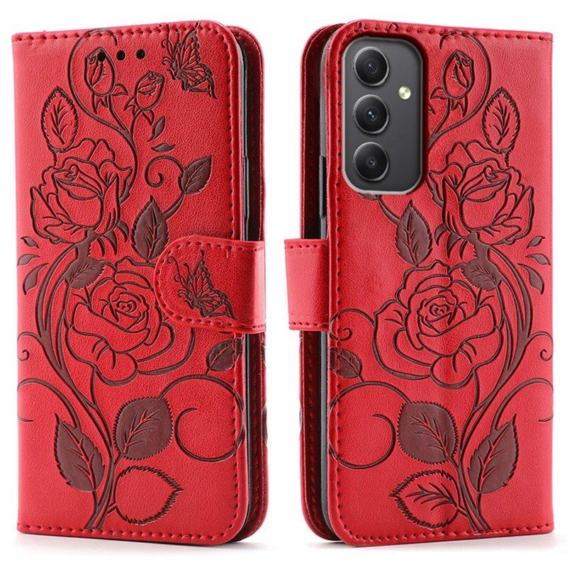 Samsung Galaxy A35 5G Fodral Ställ Impräntad Rosfjäril Konstläder - Röd