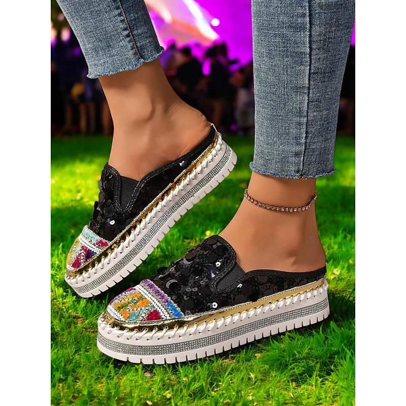 Women's Gold Sequin Platform Mules Sneakers – Sparkly Slip-On Shoes with Embroidered Details for Festivals, Party Street Fashion