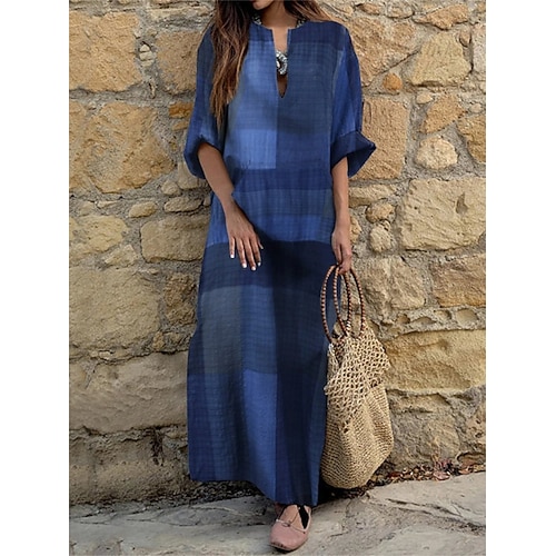 Per donna Blu Arancione Marrone Estate Primavera Abito maxi Misto cotone Vestito Casual Abito estivo in cotone Essenziale Maturo Quotidiano Vacanza Vestibilità regolare Plaid Scollo a V
