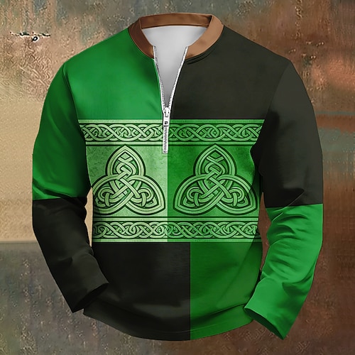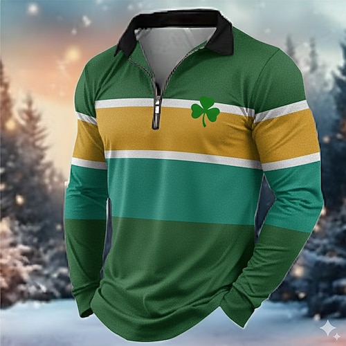 San Patrizio Per uomo A righe Trifoglio Polo Manica Lunga Collo ripiegato Moderno Tempo libero Athleisure Casual Quotidiano Festival Cerniera Stampa 3D Primavera Autunno Nero Verde Grigio