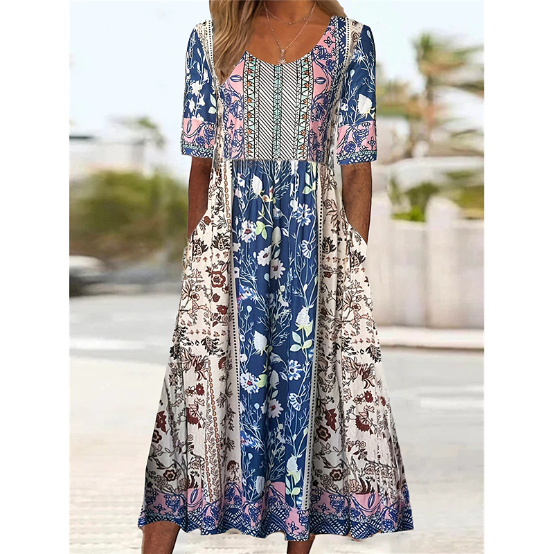Women's Midi Dress Casual Dress Summer Dress Boho Dress Ethnic Casual Vacation Daily Date Regular Fit Floral Short Sleeve Crew Neck Blue White Navy Blue Royal Blue Summer
