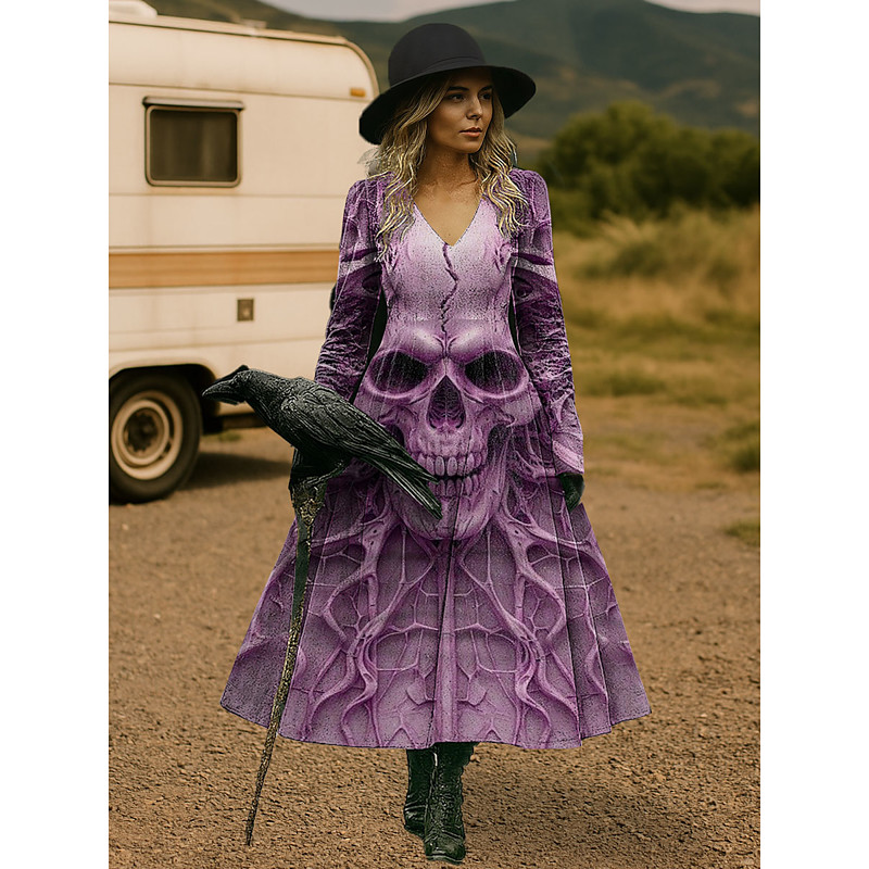 Women's Midi Dress A Line Dress Vacation Casual Daily Holiday Date Regular Fit Graphic Skull Long Sleeve V Neck Light Yellow Blue Purple Green Fall Winter
