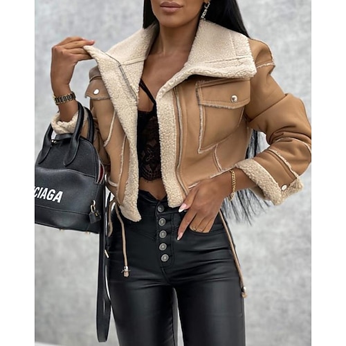 Per donna Giacca in Ecopelle Giacca Sherpa Caldo Confortevole Cerniera Tasca Con cintura Casual Tinta unica Vacanza Streetwear Casuale Abbigliamento quotidiano Regolare Collo ripiegato Vestibilit