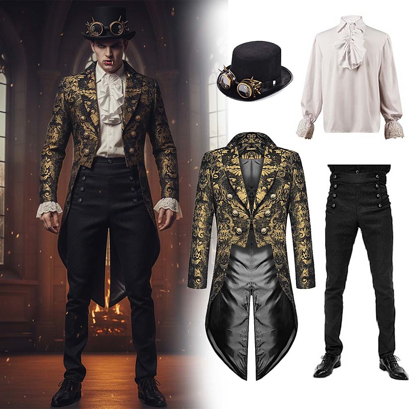 Set with Steampunk Tailcoat High Waisted Pants Top Hat with Goggles Retro Medieval Coat Jacket Outerwear Straight Leg Pants Outfits Men's Ebenezer Scrooge Elf Costume Masquerade Christmas Party