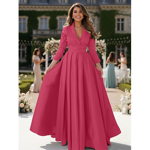 Linea ad A Lunghezza al pavimento Abito in Raso Vestito da Festa Abito da invitata a nozze Abito da cerimonia per signora Manica 3/4 Scollo a V Elegante Formale Raso con Fascia / Nastro Pieghe