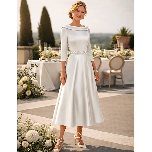 Linea ad A Abito Lunghezza Tè Vestito da Festa Abito da Cocktail Abito da invitata a nozze Abito da cerimonia per signora Manica 3/4 Scollo a Barca Elegante Vintage Ospite di nozze Raso con Perline