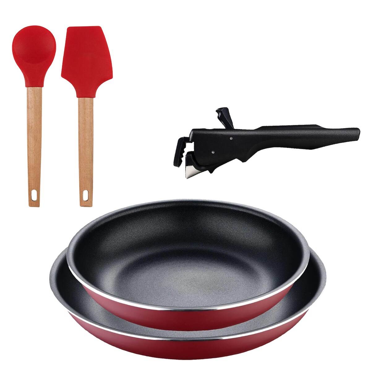 BERGNER - Set aus 2 Pfannen Ø22/26 cm gepresstes Aluminium Rot mit abnehmbarem Griff mit Set aus 2 Küchenutensilien EXCALIBUR