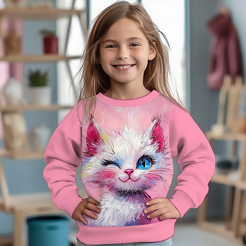 Mädchen 3D Katze Sweatshirt Langarm Frühling Herbst Mode Basic Kinder 4-12 Jahre Rundhalsausschnitt Outdoor Lässig Täglich Normale Passform