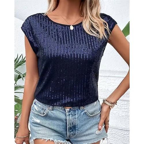 Per donna Maglietta Top estivi Tinta unica Elegante Classico Moderno Senza Maniche Girocollo Top Regolari Quotidiano Uscire Weekend Paillettes Patchwork Nero Bianco Vino Blu Reale Bianco sporco