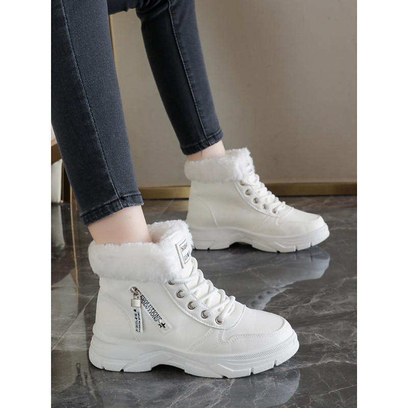 Women's White Warm High-Top Sneakers with Faux Fur Lining - Trendy Chunky Sole Winter Shoes for Casual Outdoor Wear