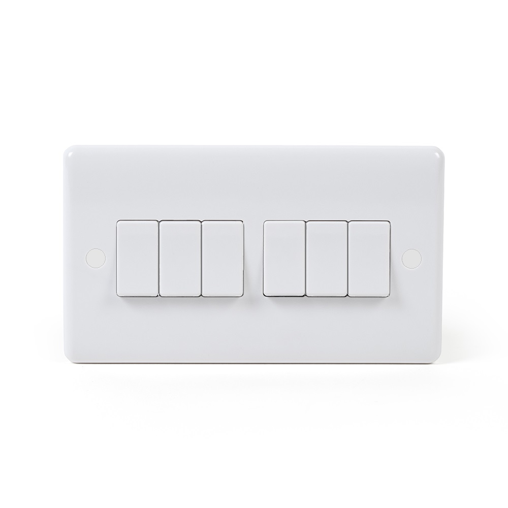 Lieber Silk White 6 Gang 2 Way 10A Light Switch - Curved Edge