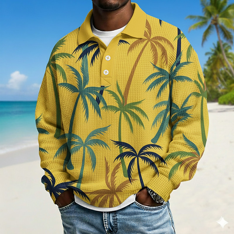 Men's Palm Tree Waffle Polo Shirts Long Sleeve Polo Shirts Lapel Hawaiian Athleisure Daily Wear Vacation Wear 3D Print Spring Fall Winter Blue White Yellow