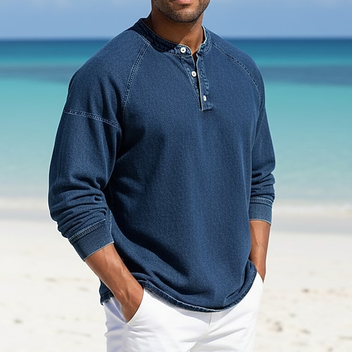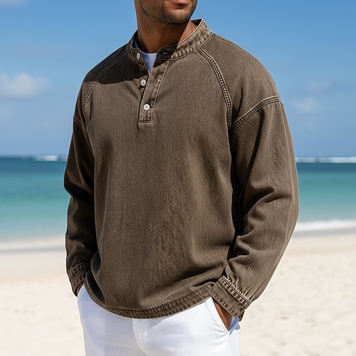 Per uomo Maglietta Maglia Henley Camicia 100% cotone lavaggio acido Manica Lunga Collo alla coreana Henley Estate Primavera Autunno Semplice Vintage Streetwear Casual Lavato Manica corta Casuale Casa