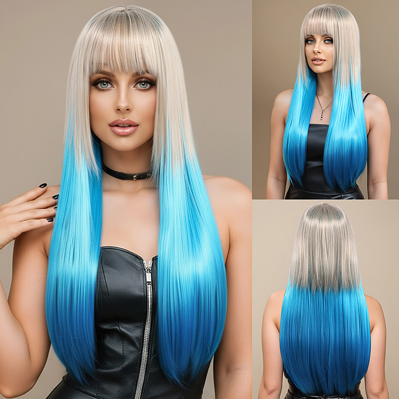Synthetic Wig Straight kinky Straight Layered Haircut Neat Bang Machine Made Wig 26 inch Azure Synthetic Hair Women's Classic Comfortable Color Gradient Multi-color