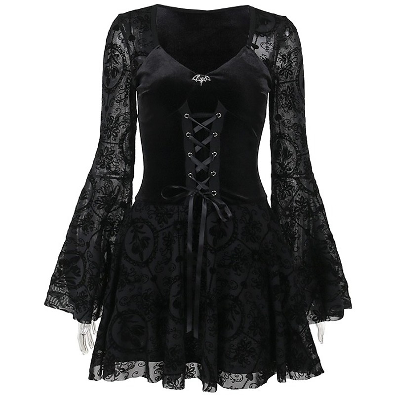 Gothic Mini Dress Bell Sleeve Witch Lace Velvet Corset Floral Fancy Dress Women's Fantasy Halloween Carnival Performance Party Adults Dress