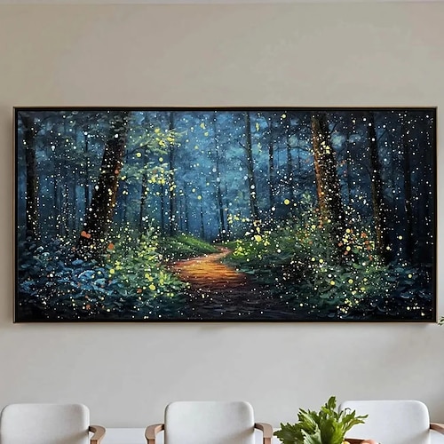 dipinto a olio fatto a mano su tela, decorazione da parete, moderno paesaggio forestale astratto di notte per soggiorno, arredamento per la casa, dipinto appeso con cornice allungata/dipinto