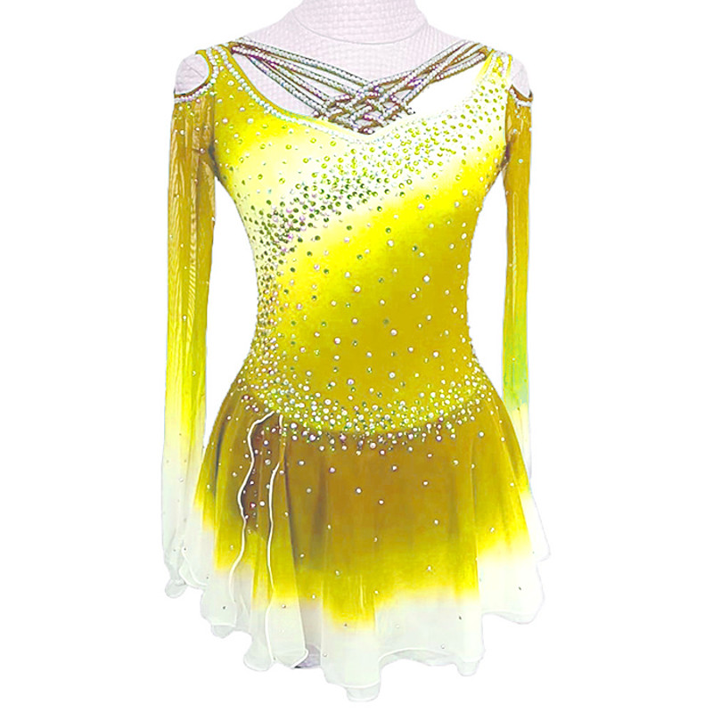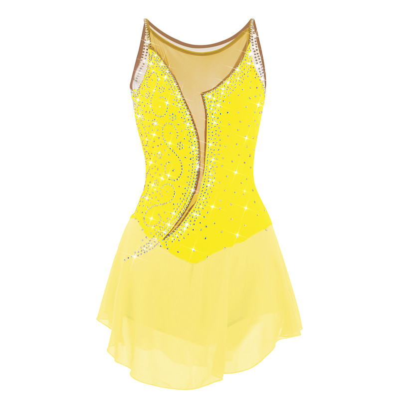 Figure Skating Dress Women's Girls' Ice Skating Dress Yellow Patchwork Open Back Mesh Spandex Stretchy Training Practice Professional Skating Wear Thermal Warm Crystal / Rhinestone Sleeveless Ice