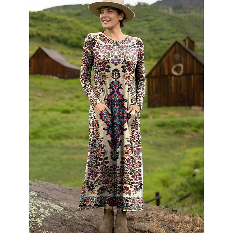 Women's Maxi Dress Vintage Bohemian A Line Dress Crew Neck Long Sleeve Casual Dress Winter Dress Swing Dress Fashion Streetwear Modern Outdoor Daily Date Fit Floral Pink Blue Purple Fall Winter