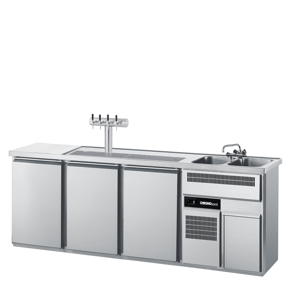 CHROMOnorm Getränketheke mit zwei Becken rechts und drei Türen