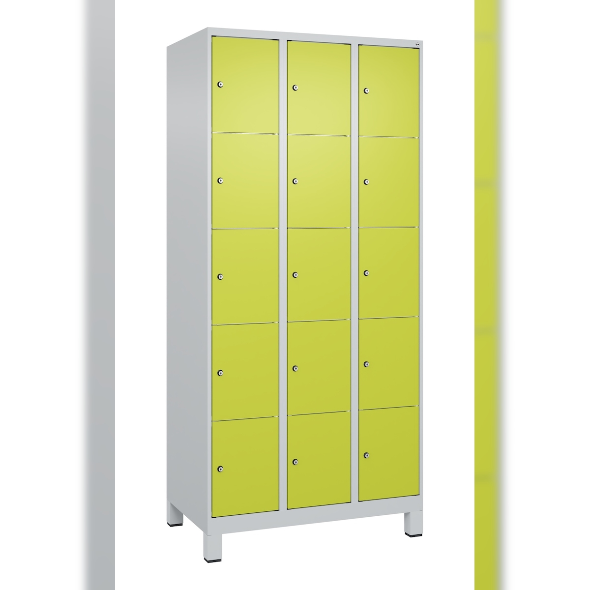 C+P Schließfachschränke Classic PLUS, Füßen, 15 Abteile, HxBxT 195x90x50cm, Zylinderschloss, Hellgrau/Clowngrün von PROREGAL