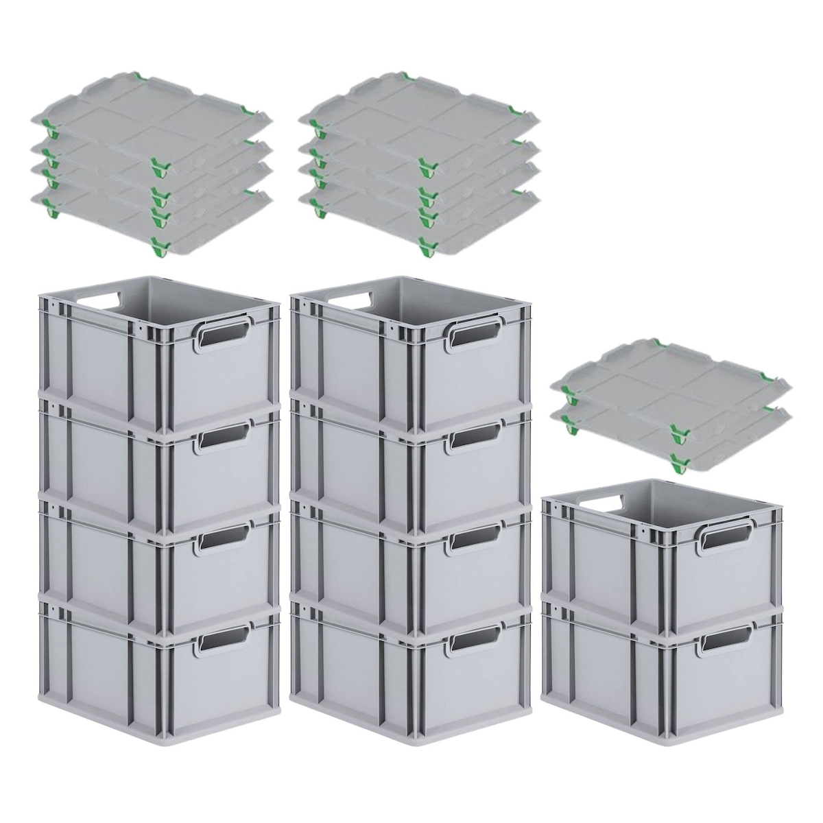 PROREGAL SparSet 10x Eurobox NextGen Economy mit Auflagedeckel & 4x Verschlüsse Schwarz, Griffe offen, HxBxT 12x30x40cm, 11L, Eurobehälter, Box