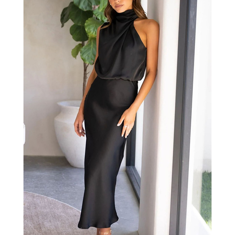 Women's Midi Dress Satin Dress Black Dress Sheath Dress Elegant Fashion Modern Daily Vacation Going out Regular Fit Plain Sleeveless Halter Neck Black Light Green Navy Blue Rose Red Summer Spring
