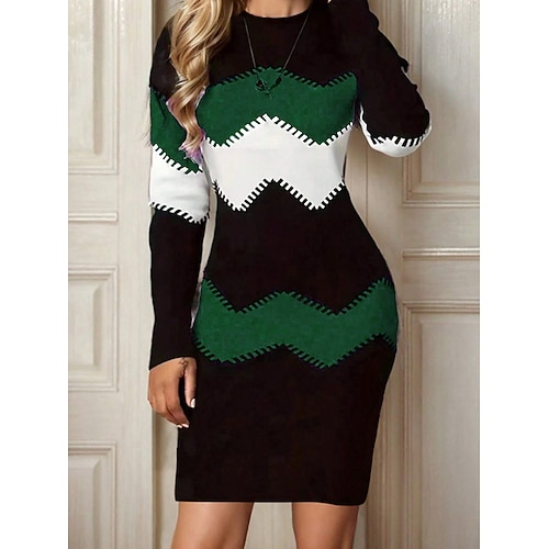 Per donna Abito Midi Tubino Casual Quotidiano Vestibilità regolare Geometrico Manica Lunga Girocollo Nero Rosso Verde Primavera Autunno