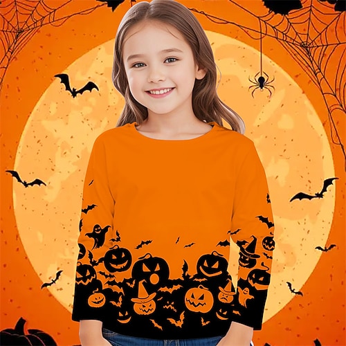 Halloween Mädchen 3D Kürbis T-Shirt Langarm Frühling Herbst Mode Basic Kinder 4-12 Jahre Rundhalsausschnitt Outdoor Lässig Täglich Normale Passform