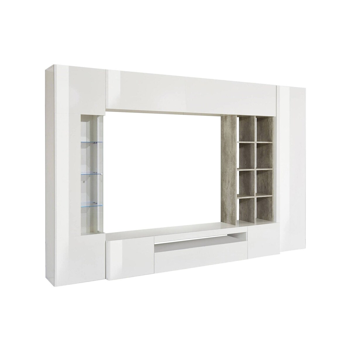 Dmora Wohnzimmermöbel Ocean, TV-Ständer Wohnzimmer-Set, Mehrzweck-Wohnzimmermöbel mit LED-Beleuchtung, cm 290x40h192, glänzend weiß und Zement