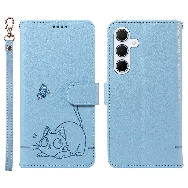 Samsung Galaxy A55 5G Plånboksfodral Konstläder Kattmönster - Ljusblå