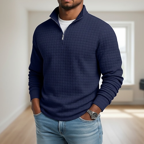 Per uomo Geometrico Plaid Nido d'ape Felpa Moda Quotidiano Classico Casual Collo alla coreana Zip a un quarto All'aperto Casa Ufficio Lavoro Blu Marrone Verde Grigio Con zip Autunno Inverno