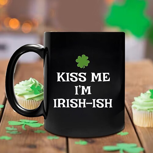 St. Patrick's Day Geschenkbecher aus schwarzer Keramik mit Kleeblattmotiv und Aufschrift „Kiss Me I'm Irish" – ein perfektes Geschenk für Männer. Trinkgefäße für irische Festpartys für Frauen