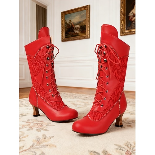 stivali da donna in similpelle rossa con lacci e tacchi, in stile vittoriano - stile gotico vintage anni '20 per carnevale, feste e occasioni in costume