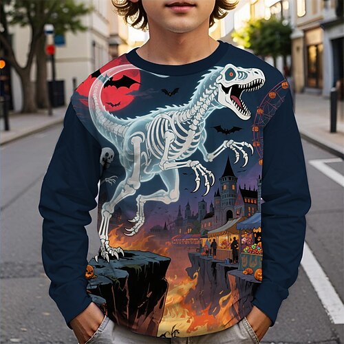 Halloween Jungen 3D Kürbis Dinosaurier T-Shirt Langarm Frühling Herbst Mode Basic Kinder 4-12 Jahre Rundhalsausschnitt Outdoor Lässig Täglich Normale Passform