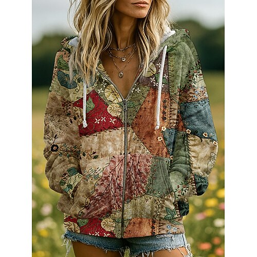Womens 3D Druck Vintage Boho Kapuzenpullover Patchwork Kapuzenpullover Sweatshirt Floral Reißverschluss Mode Casual Langarm Kapuze Street Alltagsmode Casual Patchwork Reißverschlusstasche Rosa Rot