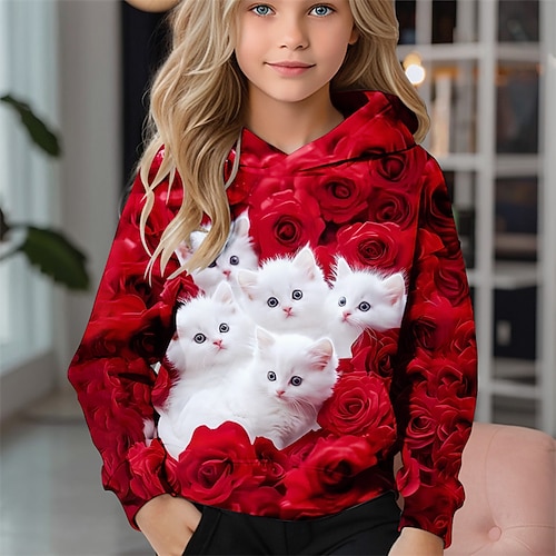 Mädchen 3D Katze Kapuzensweatshirt Pullover Langarm 3D-Druck Frühling Herbst Aktiv Mode Niedlich Kinder 3-12 Jahre Mit Kapuze Outdoor Lässig Täglich Normale Passform